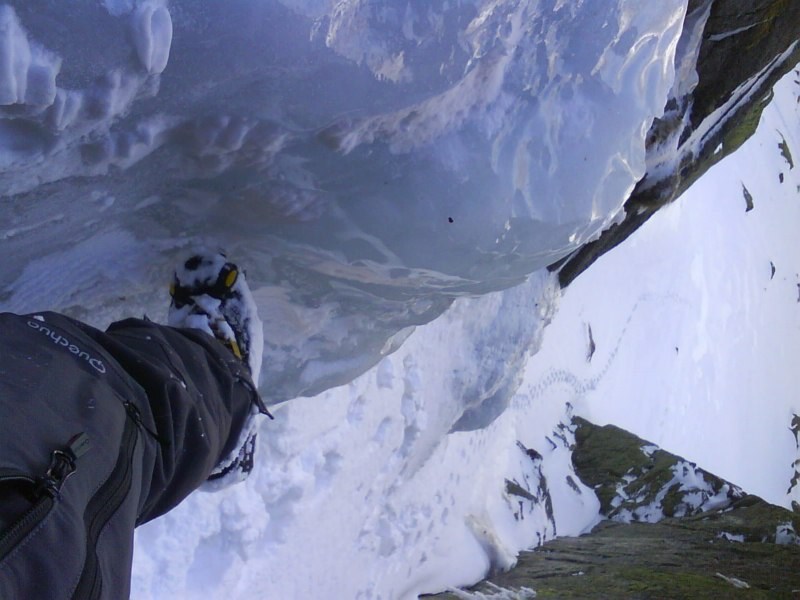 Me quité los crampones para subir y la verdad es que lo pasé bastante mal, habia zonas muy heladas y mojadas que mas de un susto me dieron.